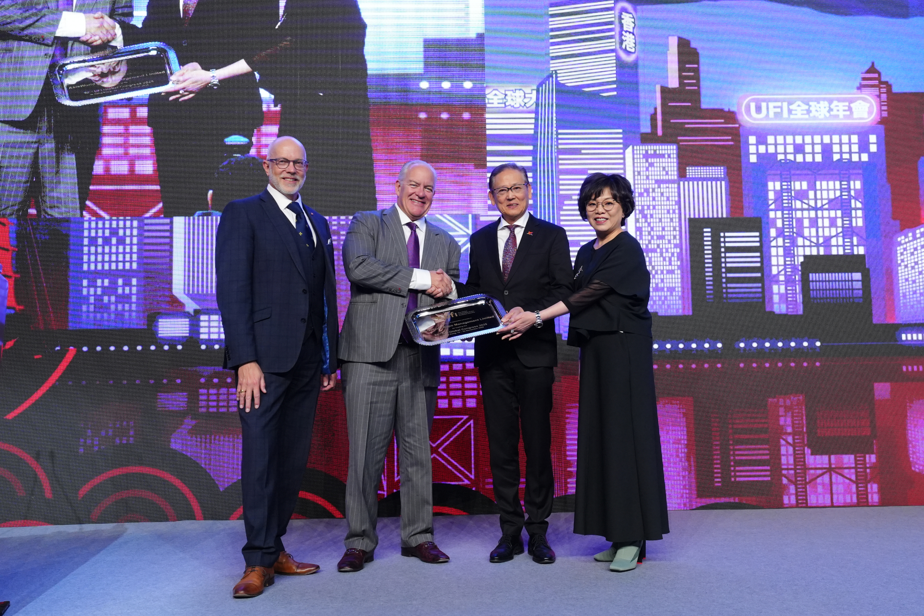 亞博館主席李天柱先生及行政總裁陳芳盈女士接過UFI代表頒發之紀念狀,象徵亞博館作為是次UFI全球年會主辦場地意義非凡。